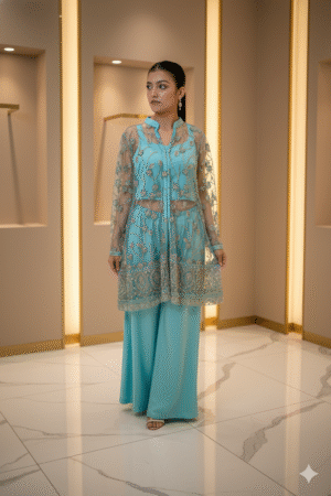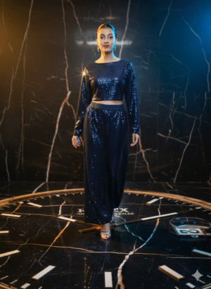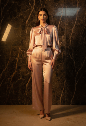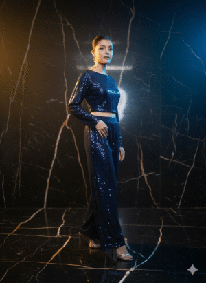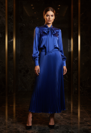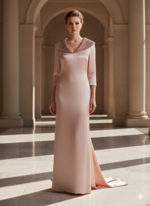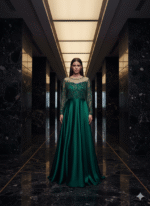 The gown flows into a rich satin full-length skirt, mirroring the depth of polished gemstone surfaces. With soft movement and high-sheen brilliance, this piece embodies opulence, refinement, and the quiet confidence of luxury craftsmanship — a perfect balance of European elegance and couture radiance.