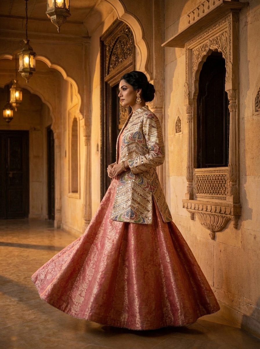 The Heritage Regalia Ensemble is a celebration of timeless craftsmanship — a dialogue between mirror-worked tradition and brocade grandeur.