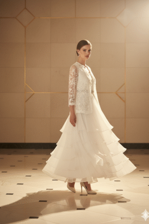 The Highland Midnight Ensemble blends refined navy tailoring with heritage plaid artistry. A British female model brings the outfit to life, wearing the navy trousers paired with the navy-red plaid wrap-style tunic, creating a sophisticated fusion of structure and elegance. Soft cinematic light reveals the richness of the fabrics — smooth navy suiting and crisp plaid cotton — each reflecting depth, precision, and timeless luxury. Inspired by Rolex, Tom Ford, and Louis Vuitton visual codes, this look embodies quiet power and modern heritage refinement.
