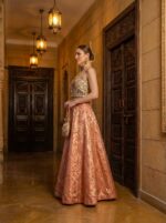 The Mirror Aura Ensemble captures the poetic essence of old-world craftsmanship through hand-set mirror embroidery and jacquard-inspired brocade richness.