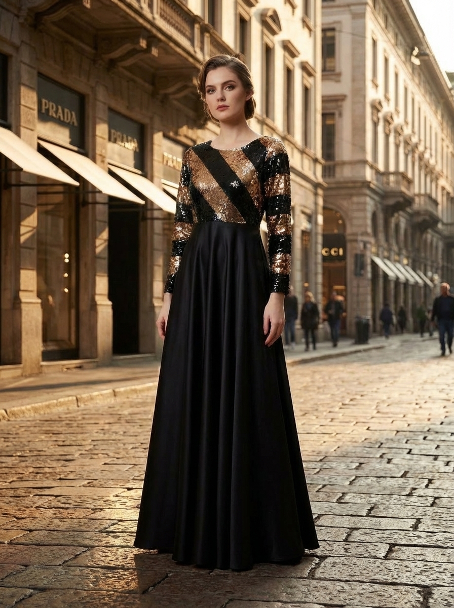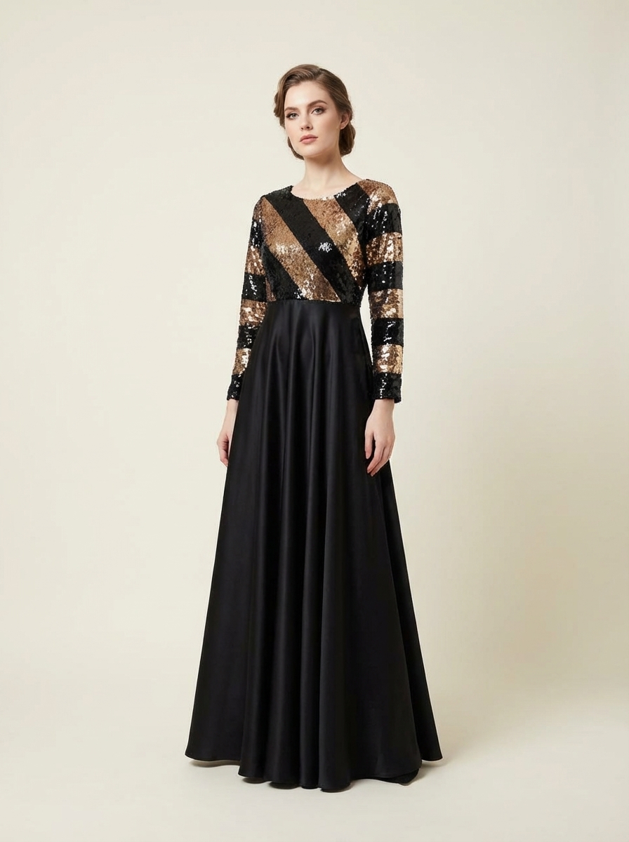 A sculpted bodice adorned with diagonal black and antique-gold sequins creates a powerful architectural statement, while the fluid black skirt falls in graceful, uninterrupted movement.