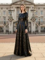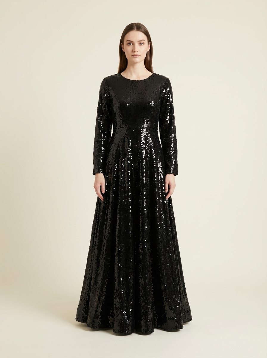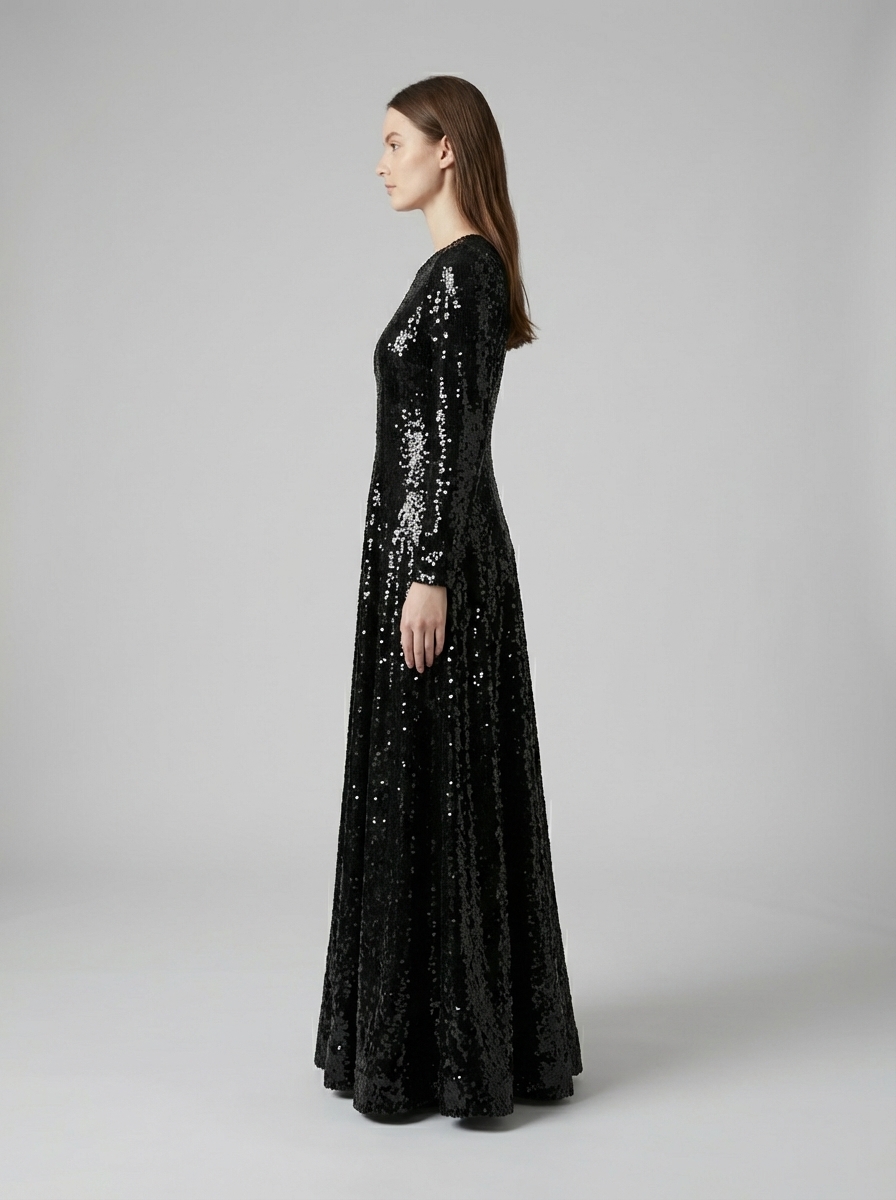 The Noir Celestia Gown is a sweeping full-length couture silhouette, adorned in dense black sequins that shimmer like liquid obsidian under light. Its long sleeves and sculpted bodice create a refined, elongated frame that moves with a quiet yet powerful elegance. The fabric captures cinematic reflections—every step revealing a new dimension of depth and shadow. This is evening luxury at its most commanding, blending the mystique of Tom Ford glamour with the timeless poise of Elie Saab craftsmanship.