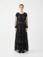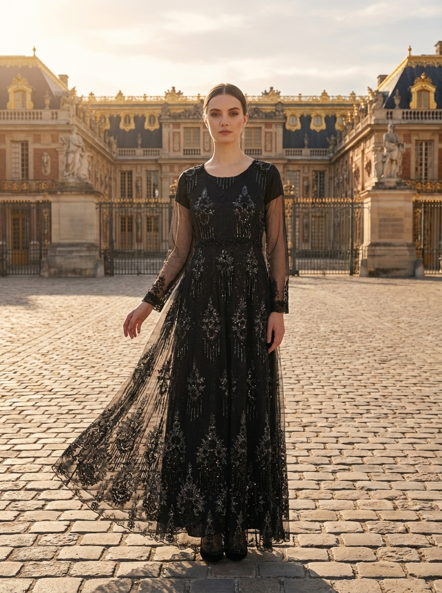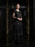 The Noir Veil Étoile Gown is crafted in sheer black tulle layered with intricate tonal embroidery that glimmers subtly under light. Its softly cinched waist and fluid A-line silhouette create graceful movement, while sheer sleeves add an ethereal couture finish. The embroidery cascades vertically, elongating the form and enhancing its regal presence. A refined expression of modern evening luxury, designed for understated power and nocturnal elegance.