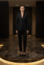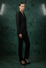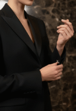 The Eclipse Noire Tuxedo embodies the precision and poise of British tailoring, crafted from superfine Italian wool with satin lapels that shimmer like liquid obsidian. Its clean silhouette and sculpted shoulders create a dialogue of quiet confidence — refined yet commanding. Under diffused gold light, the fabric reveals tones of graphite and midnight, evoking timeless sophistication. Styled on a poised British model, the ensemble channels the aura of London’s Savile Row elegance through the lens of Bint-e-Fareed’s modern luxury.