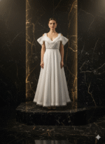 The Opaline Reverie Gown is crafted in shimmering opaline-textured fabric that captures and bends light like crushed crystals, creating a celestial glow.