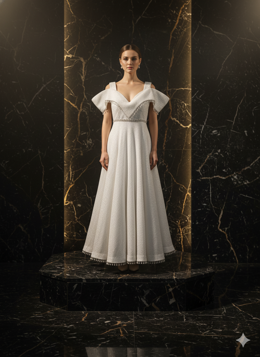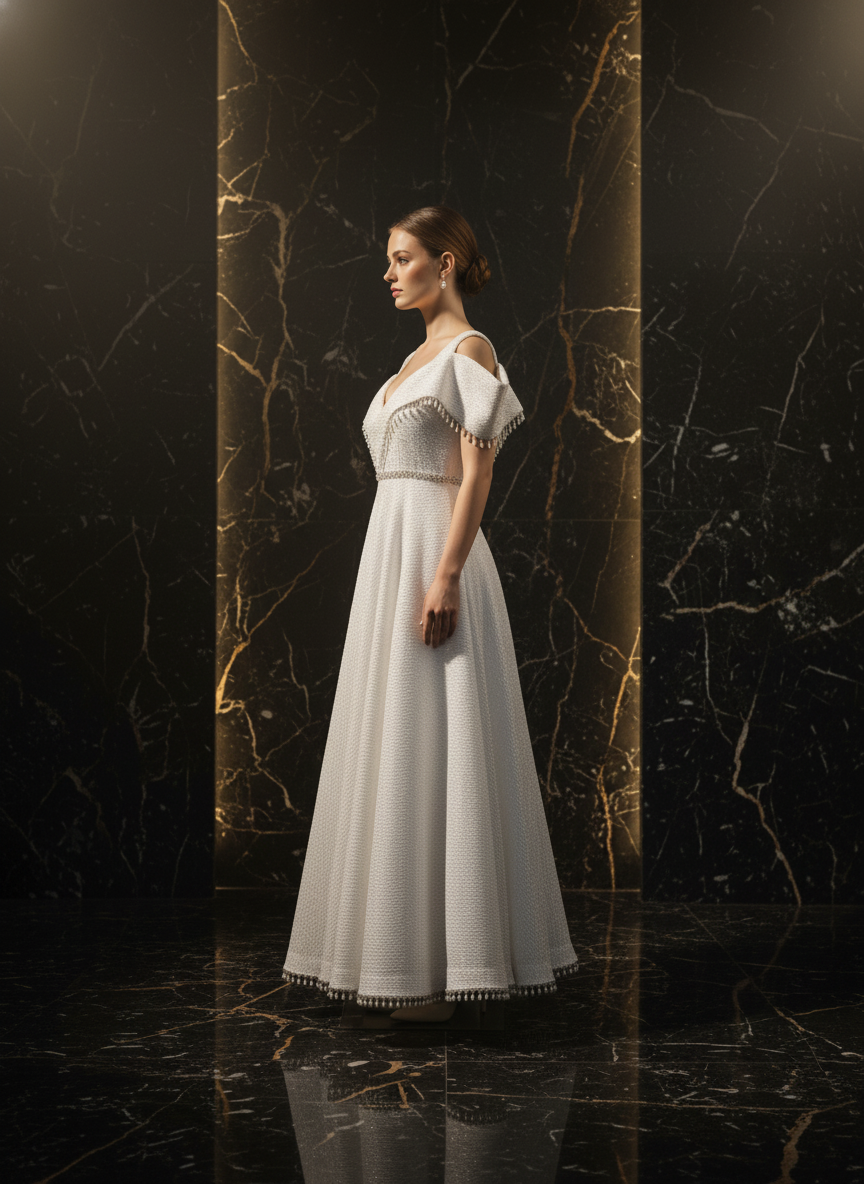 Where celestial light meets sculpted couture.