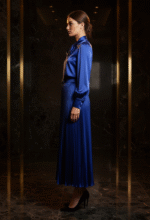 The Crimson Grace Ensemble embodies the essence of soft power and cinematic femininity. Crafted from lustrous silk-satin, the rich crimson blouse features a romantic pussy-bow neckline and softly gathered sleeves that drape effortlessly. It’s paired with a pleated asymmetric skirt with a delicate rippled hem, designed to move gracefully with every step. Inspired by the elegant drama of Tom Ford and Louis Vuitton campaigns, this set radiates bold elegance, timeless refinement, and contemporary couture energy.