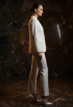 A luminous ivory ensemble that embodies modern couture refinement. The structured blazer is crafted in satin and hand-embroidered with intricate pearl beadwork, creating an elegant wave pattern that catches the light with subtle brilliance. Paired with flowing, broad-bottom trousers that elongate the silhouette, the set exudes understated power and grace. Inspired by the cinematic elegance of Louis Vuitton and Tom Ford campaigns, this piece is designed for the woman who moves with confidence, luxury, and timeless sophistication.