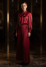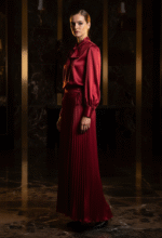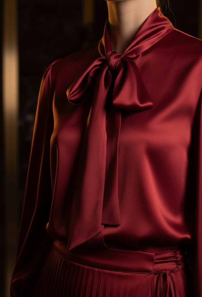 The Sapphire Poise Ensemble captures the essence of modern elegance with a touch of regal drama. Crafted from lustrous satin, the rich royal blue blouse features a romantic pussy-bow neckline and fluid sleeves with structured cuffs — a silhouette that exudes confidence and refinement. It’s paired with a pleated asymmetric skirt, designed with a rippled hem that flows gracefully with movement, creating a statuesque effect. Inspired by the timeless sophistication of Tom Ford and Louis Vuitton campaigns, this look embodies understated power, couture craftsmanship, and after-dark elegance.