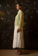 The Verde Lace Ensemble blends ethereal grace with a whisper of couture refinement. The delicate green lace jacket, crafted with intricate floral embroidery, is paired with a flowing white tiered maxi dress in crisp cotton for an effortless yet elevated silhouette. Its soft structure and light layering create a harmonious balance of texture and movement, capturing a sense of serene sophistication. Inspired by the quiet luxury of Louis Vuitton and Elie Saab campaigns, this look embodies feminine elegance and timeless beauty.